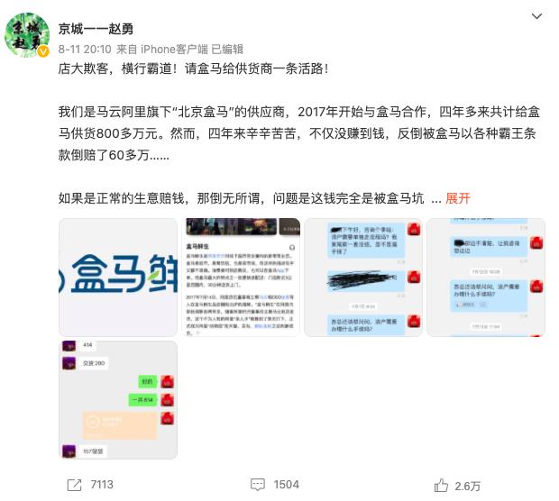 11日,阿里旗下新零售业态——盒马鲜生,被某供应商网络发文控诉“店大欺客”。其称,自2017年与盒马合作以来,4年时间共计给盒马供货800多万元,不仅没赚到钱,反倒因盒马各种霸王条款倒赔60多万元。