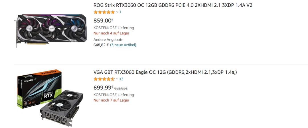 相对于国内已经降到接近原价的显卡,国外主要电商平台的显卡价格降幅显然更低,以RTX 3060为例,这款显卡在国内一度降到了3000元以下,而在国外市场的价格则依然维持在699欧元(约合人民币5500元)左右,相同的价格已经能够在国内买到RTX 3070Ti。