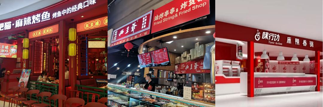 南锣肥猫·麻辣烤鱼、西王爷炸串、味行动麻辣香锅的红色招牌在商圈中非常显眼