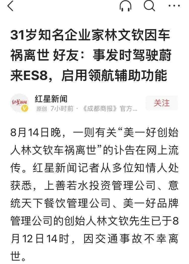 8月12日,上善若水投资管理公司创始人、意统天下餐饮管理公司创始人、美一好品牌管理公司创始人林文钦驾驶蔚来ES8遭遇车祸身亡。而此时距离蔚来的上一次严重事故只相隔了不到半个月,当时上海市浦东新区临港大道一辆蔚来EC6在高速撞击隔离石墩后车辆损毁严重,用户不幸罹难。短短半个月内两起严重交通事故,最终都是车毁人亡,在原因不明的情况下,让蔚来的领航辅助功能(蔚来曾宣传为自动驾驶功能)再受质疑,当天股价再跌3.39%。