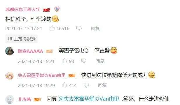 同样入驻了 B 站的中科院物理所,拥有一个非常中二的名字——「二次元的中科院物理所」。面对「发射火箭进行人工引雷」这样具有技术含量的操作,官方与评论区一起玩梗,「相信科学,科学渡劫」。
