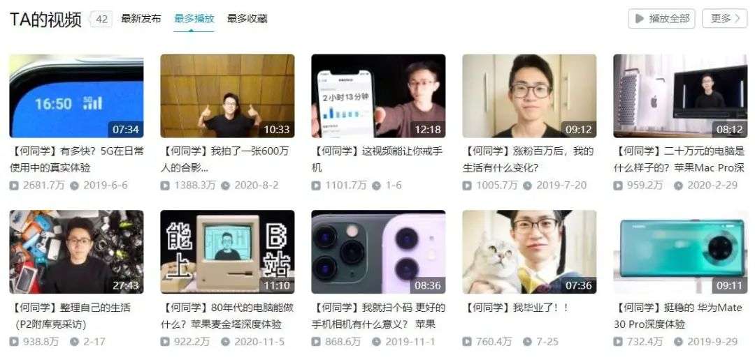 B 站@老师好我叫何同学主要发布数码产品测评,曾经因为一个测评 5G 的视频出圈,「严格意义上讲,我发布的也不能叫测评视频,我很少谈参数,更多的是主观体验和感受。大多数人看我的视频并不是为了买产品,只是为了度过快乐的 20 分钟」。