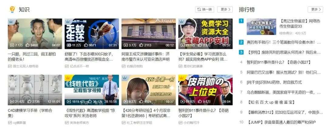 2020 年 6 月,B 站整合了知识学习类内容,正式上线知识分区,似乎希望能够从娱乐网站转变为知识平台。过去一年,有 1.13 亿用户在 B 站学习,这个数字是中国在校大学生数量的三倍多。在 B 站上升的内容品类中,科普内容播放量增长最快,高达 1994%。