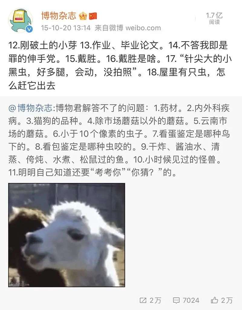 那时候,身为博物君的他,每天都会接受网友成千上万的艾特,很多人都把他当成是一本百科全书,他会耐心转发解答,偶尔还怼怼网友,高冷的作答和有趣的灵魂吸粉无数。看起来他什么都认识,但据他说是因为「只挑认识的转发」。