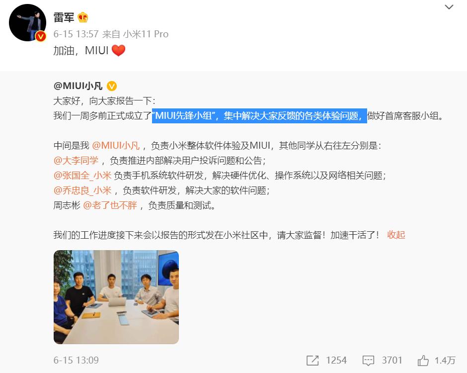 针对用户不断提出的质疑,雷军在6月中旬连着三天推送了MIUI整改的微博,决定内部成立“MIUI先锋小组”,来集中解决大家反馈的各类体验问题等。