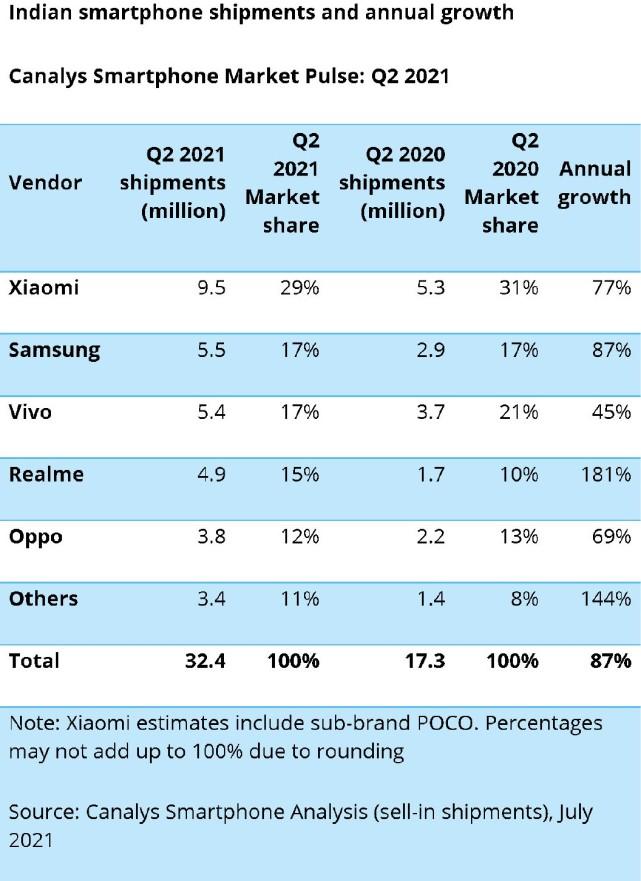 据Canalys公布的2021年Q2季度印度智能手机市场数据报告显示,小米仍是印度市场排名第一的智能手机品牌,二季度出货量达950万部,市占率29%。三星出货量为550万部,仅以17%的份额保住第二。而支撑起印度市场的主要的小米品牌就是小米手机主打性价比的“红米”子品牌。
