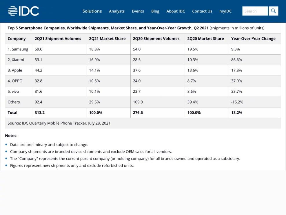 数据分析公司Canalys发布了2021Q2全球智能手机市占率排名:小米手机销量超越了苹果,首次晋升全球第二。小米Q2出货量5310万台手机,同比增长86.6%,全球智能手机市占率达到17%。