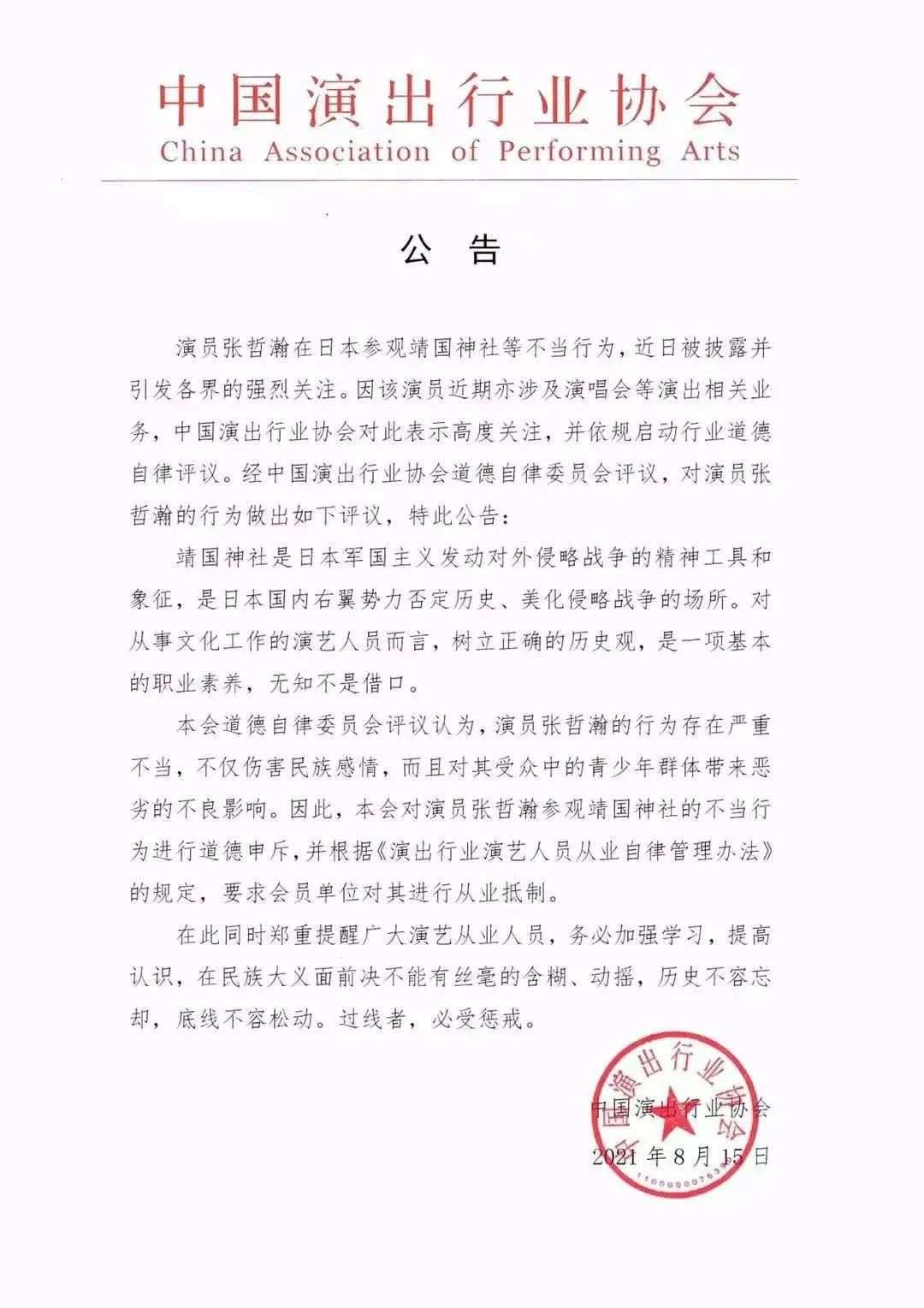 中国演出行业协会要求会员单位对张哲瀚进行从业抵制