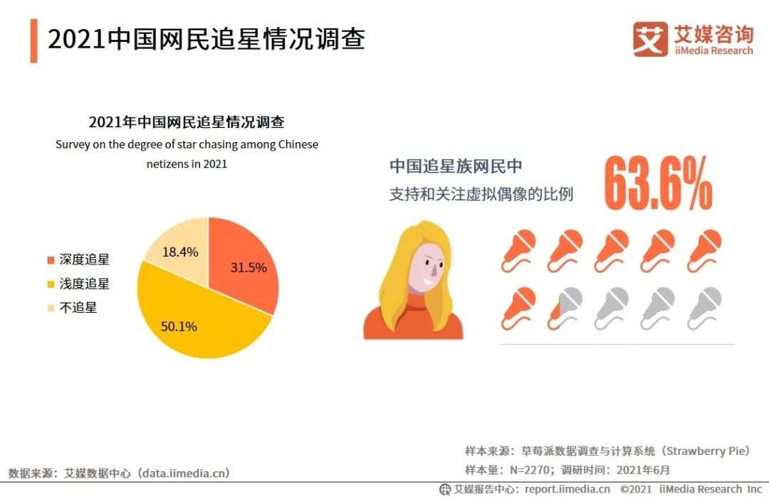 艾媒咨询数据显示,超八成网民在日常有追星的习惯,其中63.6%的网民有支持和关注虚拟偶像的相关动态。2020年,中国虚拟偶像核心产业规模为34.6亿元,同比增长70.3%,预计2021年将达62.2亿元。