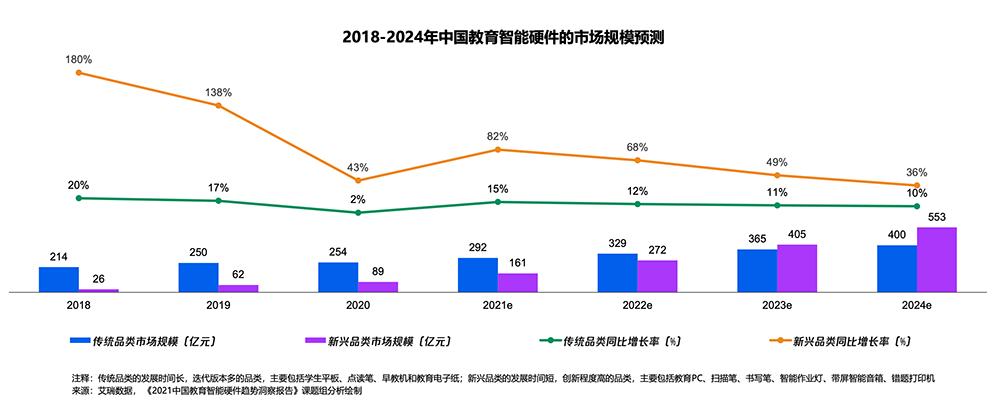▲2018-2024年中国教育智能硬件的市场规模预测(来源:腾讯研究院《2021中国教育智能硬件趋势洞察报告》)