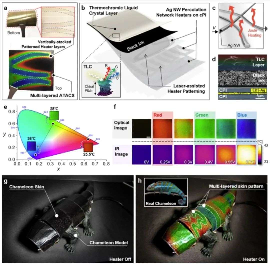 研究人员将TLC墨水层与垂直堆叠的、有图案的银(Ag)纳米线(NW)加热器集成在多层皮肤结构中,通过加热器温度的变化来控制颜色的变化。