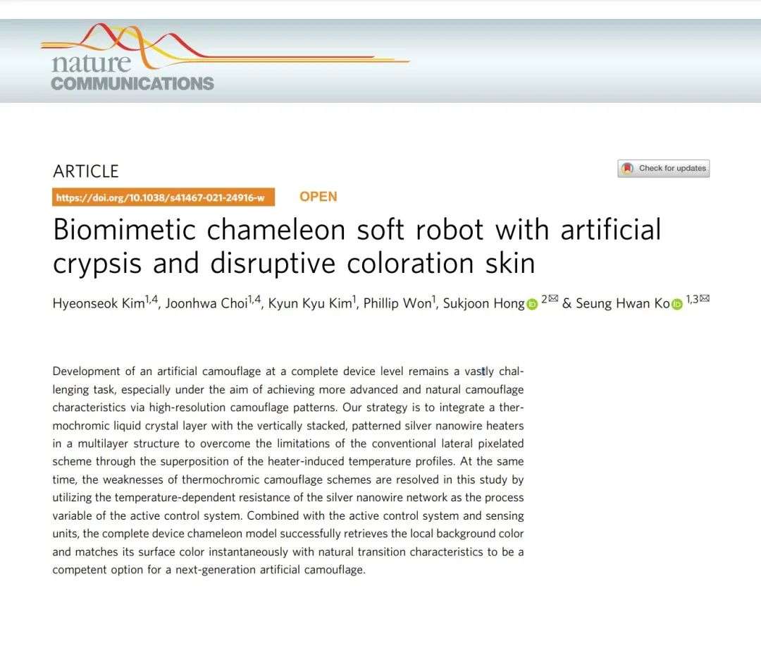 这项研究于8月10日发表在《自然通讯(Nature Communications)》上,论文题目为《具有人工隐型和破坏性有色皮肤的仿生变色龙软体机器人(Biomimetic chameleon soft robot with artificial crypsis and disruptive coloration skin)》。