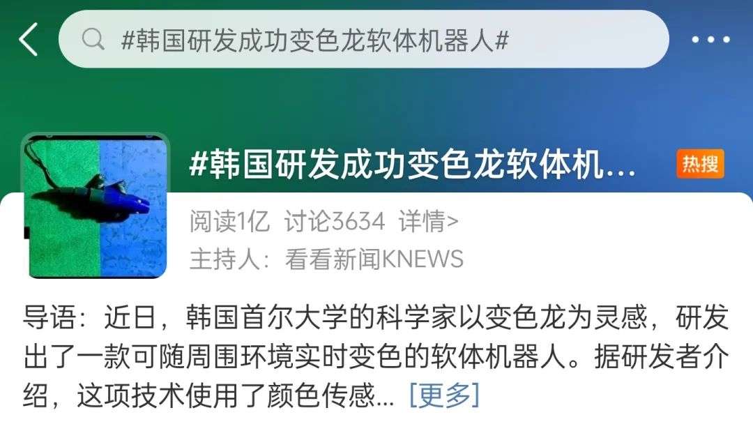 智东西8月16日消息,上周,一条#韩国研发成功变色龙软体机器人#的话题突然登上微博热搜,引起众多网友的好奇。这个机器人到底什么来头?这玩意儿是怎么实现的?别着急,我们来捋一捋。