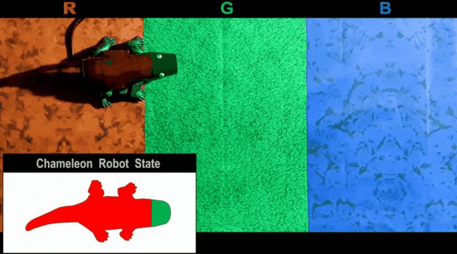 研究人员发布了一段变色龙机器人在红绿蓝三色面板上爬过的视频,展示了机器人根据需要改变自身颜色的能力。
