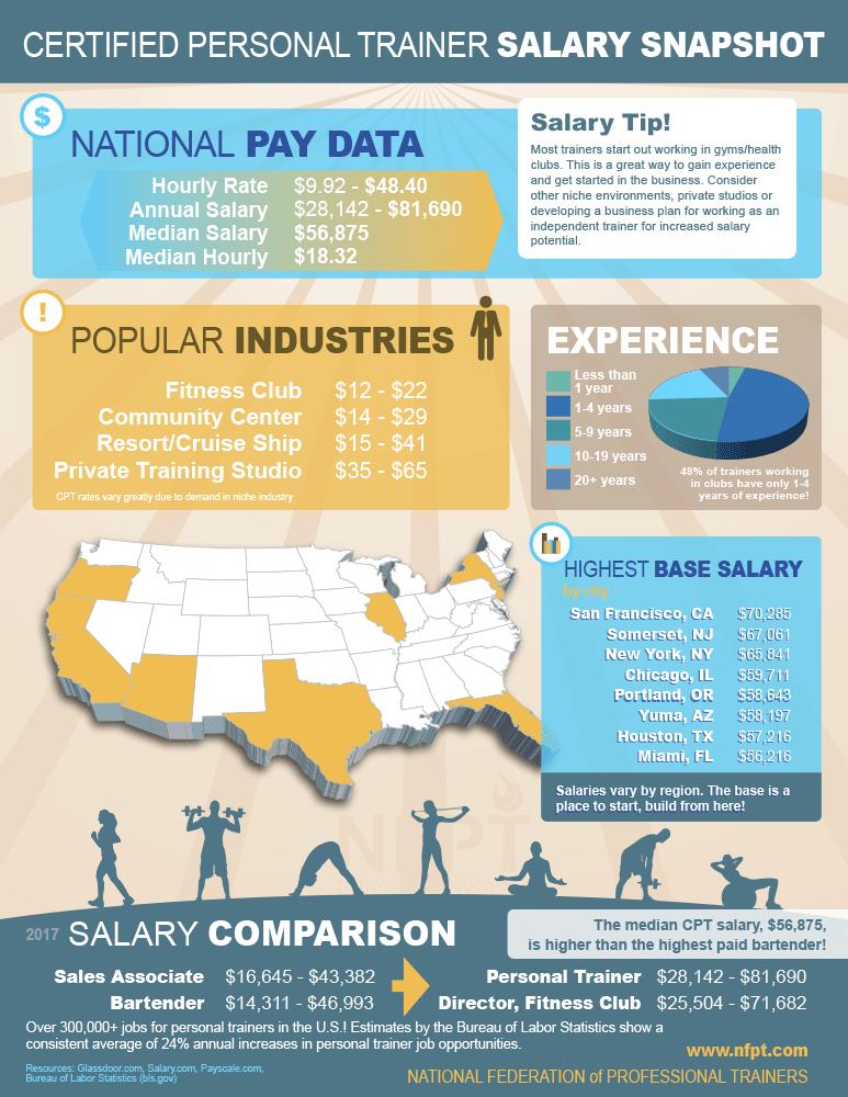 美国健身教练的薪资分布图,很大程度由个人从业经验所决定来源:NFPT