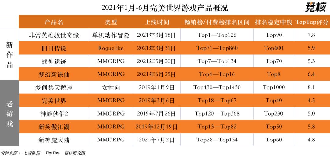 据竞核统计,2021年1月-6月,完美世界旗下老产品无一进入App Store游戏畅销榜Top10。其中表现最好的三款产品为《新笑傲江湖》(Top13)《完美世界手游》(Top18)《新神魔大陆》(Top28),但排名稳定中线均在Top30外。