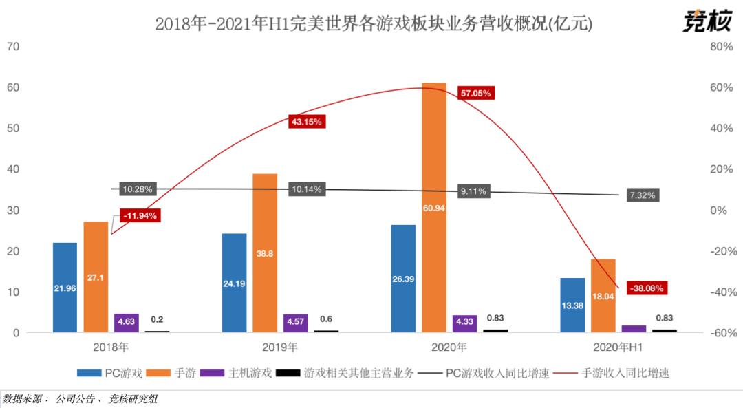 横向对比PC游戏,手游表现堪称拉跨。2021H1,完美世界手游营收仅有18.04亿元,与去年同期相比下滑38.08%。