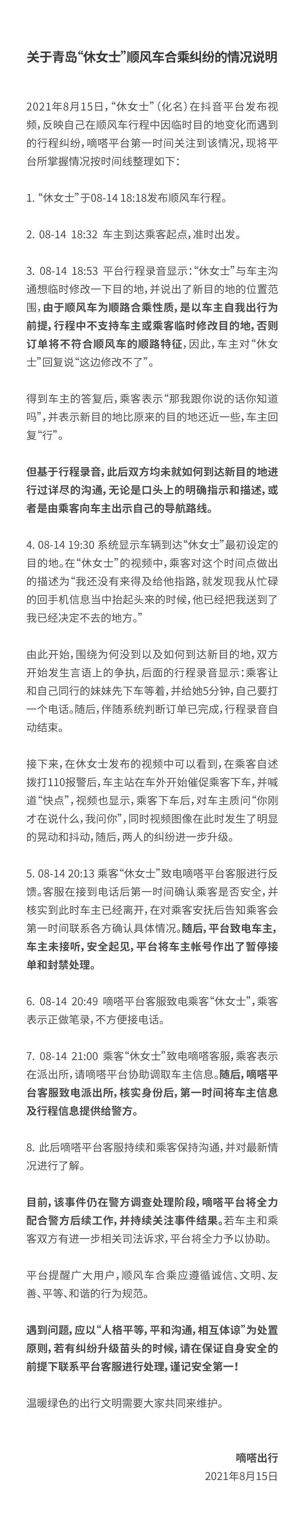 针对该事件,@嘀嗒出现发布的情况说明称,休女士于8月14日18时18分发布顺风车行程;18时32分,车主到达乘客起点,准时出发;18时53分,平台行程录音显示:休女士与车主沟通想临时修改一下目的地,并说出了新目的地的位置范围;19时30分,系统显示车辆到达休女士最初设定的目的地。由此开始,围绕为何没到以及如何到达新目的地,双方开始发生言语上的争执。