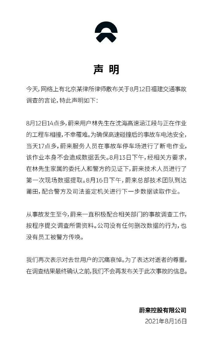 蔚来回应“技术人员私自接触涉案车辆”传闻:公司没有删改任何数据的行为