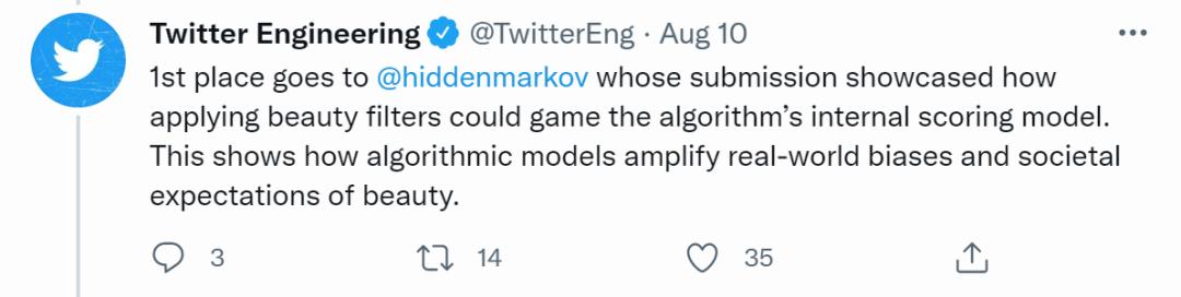 Kulynych在大赛中获得了第一名,推特称Kulynych的发现“展示了算法模型如何放大现实世界的偏见和社会对美的期望”。
