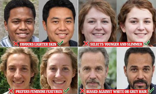 也就是说,算法会更偏好“肤色更浅、更苗条、更年轻”的面孔,而不是“肤色更深、脸型更宽、年纪更大”的面孔。