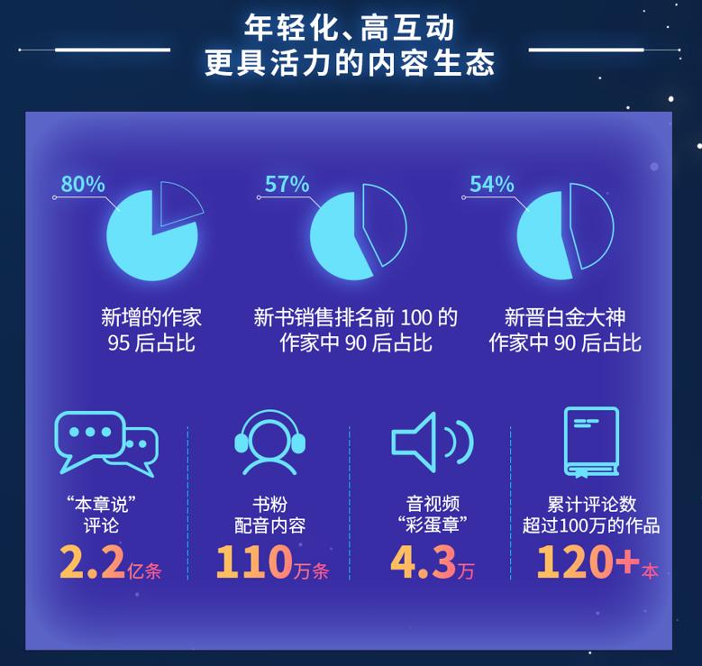 护城河的拓宽离不开平台的作者建设向生态化——多层次、精细化、年轻化——进阶的追求。2021年6月30日,平台上积累了940万作家,作品总数达到1450万部,上半年新增字数超过180亿。