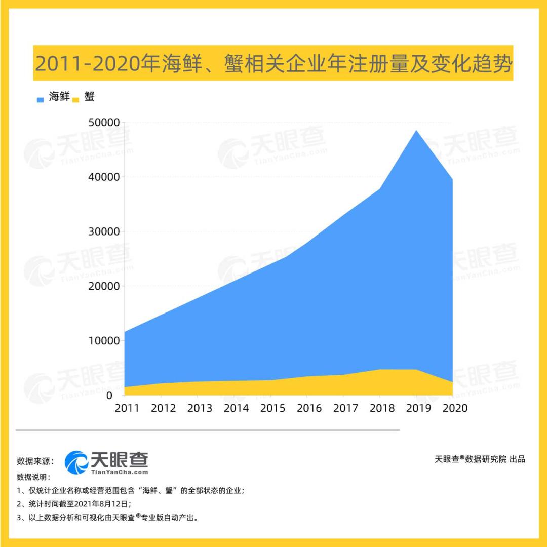 天眼查大数据显示,近些年,随着市场消费能力和养殖产量的同步发展,海鲜产业规模呈逐年上涨态势,我国现有超21万余家海鲜相关企业。其中“蟹”企超2.8万家,占整体海鲜相关企业的13.3%。