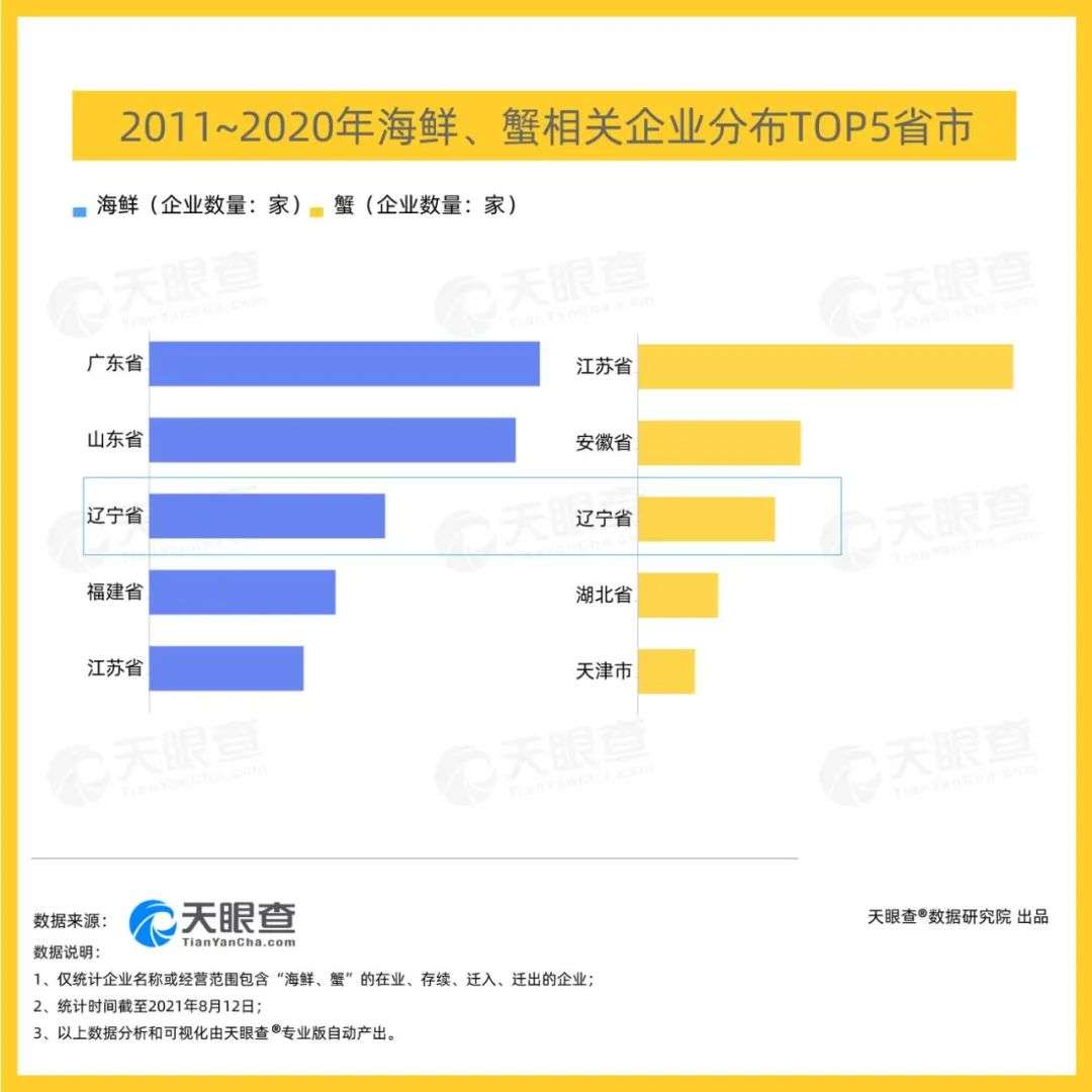 除此之外,说起海鲜大省,除了江苏省,辽宁省也不容忽视。不管是海鲜,还是蟹相关企业的数量,辽宁省都位居前三。