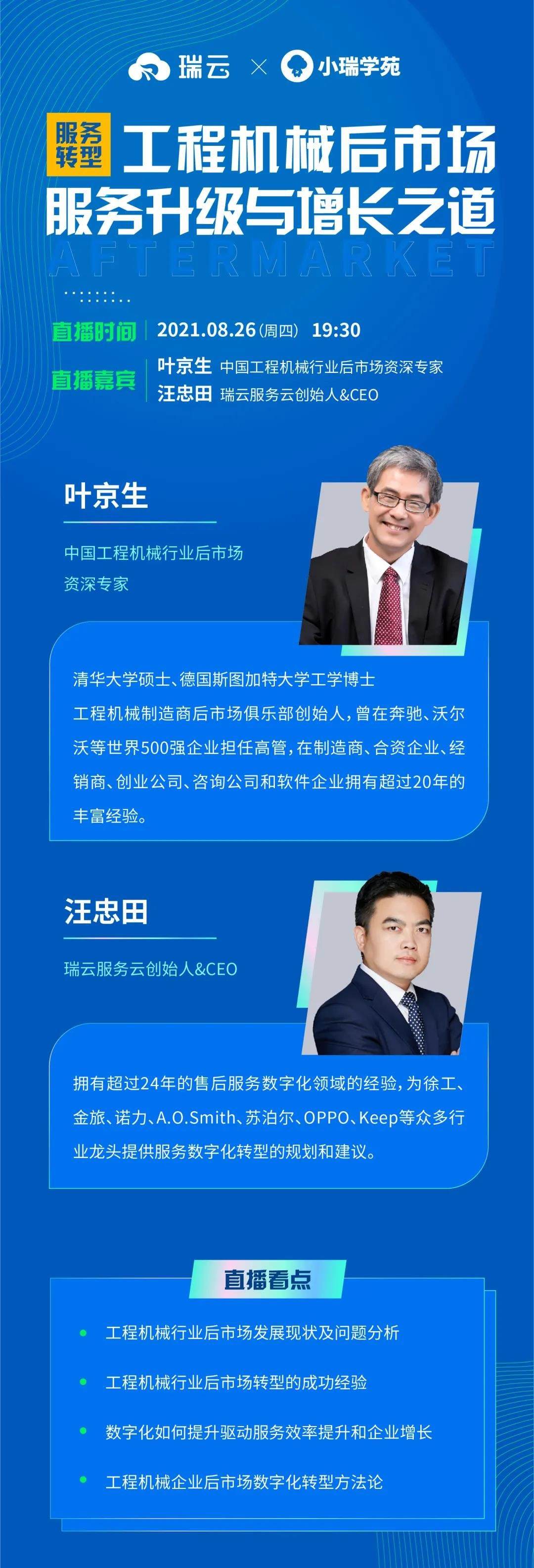 为此,8月26日(周四)19:30,瑞云服务云『小瑞学苑直播间』特别邀请到中国工程机械行业后市场资深专家叶京生先生和瑞云服务云创始人&CEO汪忠田先生为大家带来主题为“工程机械后市场服务升级与增长之道”的线上分享。