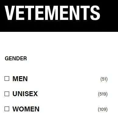 欧洲的时尚品牌 VETEMENTS 在官网的检索栏将性别分为三类:男、女、无性别,且无性别服饰的占比相当高。