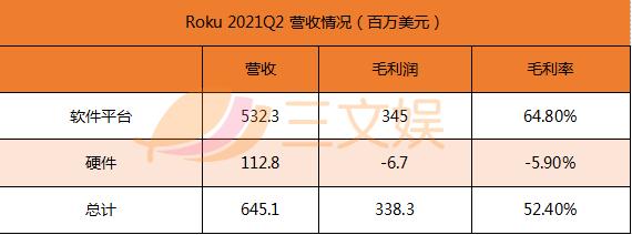 Roku延续上一年的涨势,营收增长超过8成。硬件销售毛利率为负,软件收入成为其核心盈利点。Roku平台用户在本季度增长150万,达5510万。