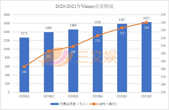 2020年年底,Vimeo的注册用户数突破2亿,付费用户达153亿,相较于拥有19亿月活用户数的Youtube来说,Vimeo尚属小众。在2021年第二季度新增4万付费用户数,总数突破160万。ARPU也达到了240美元的历史新高,同比去年增长18%。