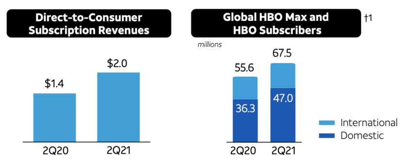 HBO Max流媒体服务于2020年5月正式上线,目前被放在和HBO一起展示营收。2021年第二季度,HBO Max和HBO的国内订阅用户为4700万人,国内与国际用户总数达6700万人,同比去年增长21.4%。国内用户平均收入略低于12美元。AT&T预测,2021年末,HBO Max的HBO的全球用户将达到7000到7300万人。