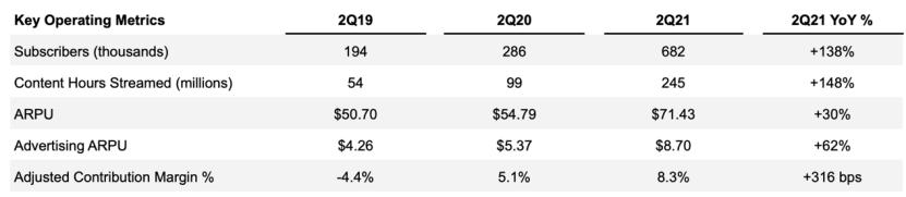 在本季度,Fubo TV的广告业务也打破了记录,广告收入达1650万美元,同比增长281%,占据总收入的13%,广告ARPU同比增长62%至8.70美元,环比增长22%。
