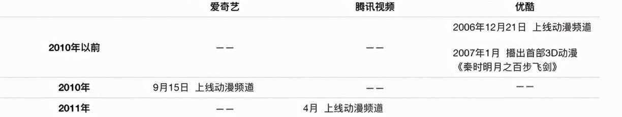 2006年,优酷正式上线动漫频道,次年1月,优酷动漫就播出了首部3D动漫《秦时明月之百步飞剑》火爆市场。随后优酷动漫不断通过获取国产动画独播版权及每年采购大量日本新番这两类方式,独揽了国内动漫市场。