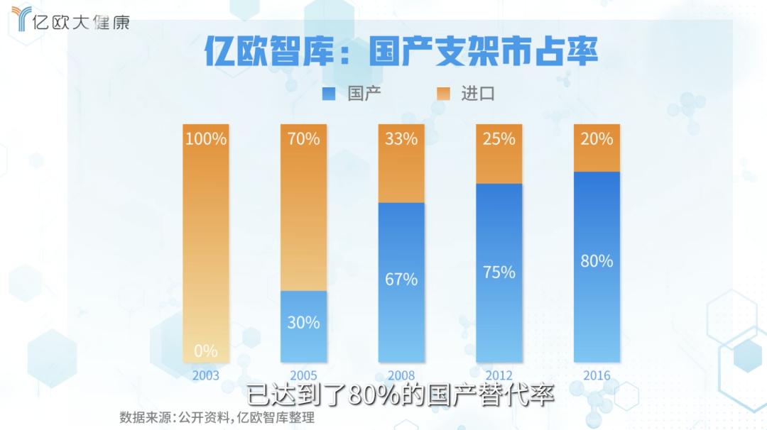 2003年以前,冠脉支架基本使用的是进口产品;而到了2016年,国产冠脉支架已达到了80%的国产替代率。