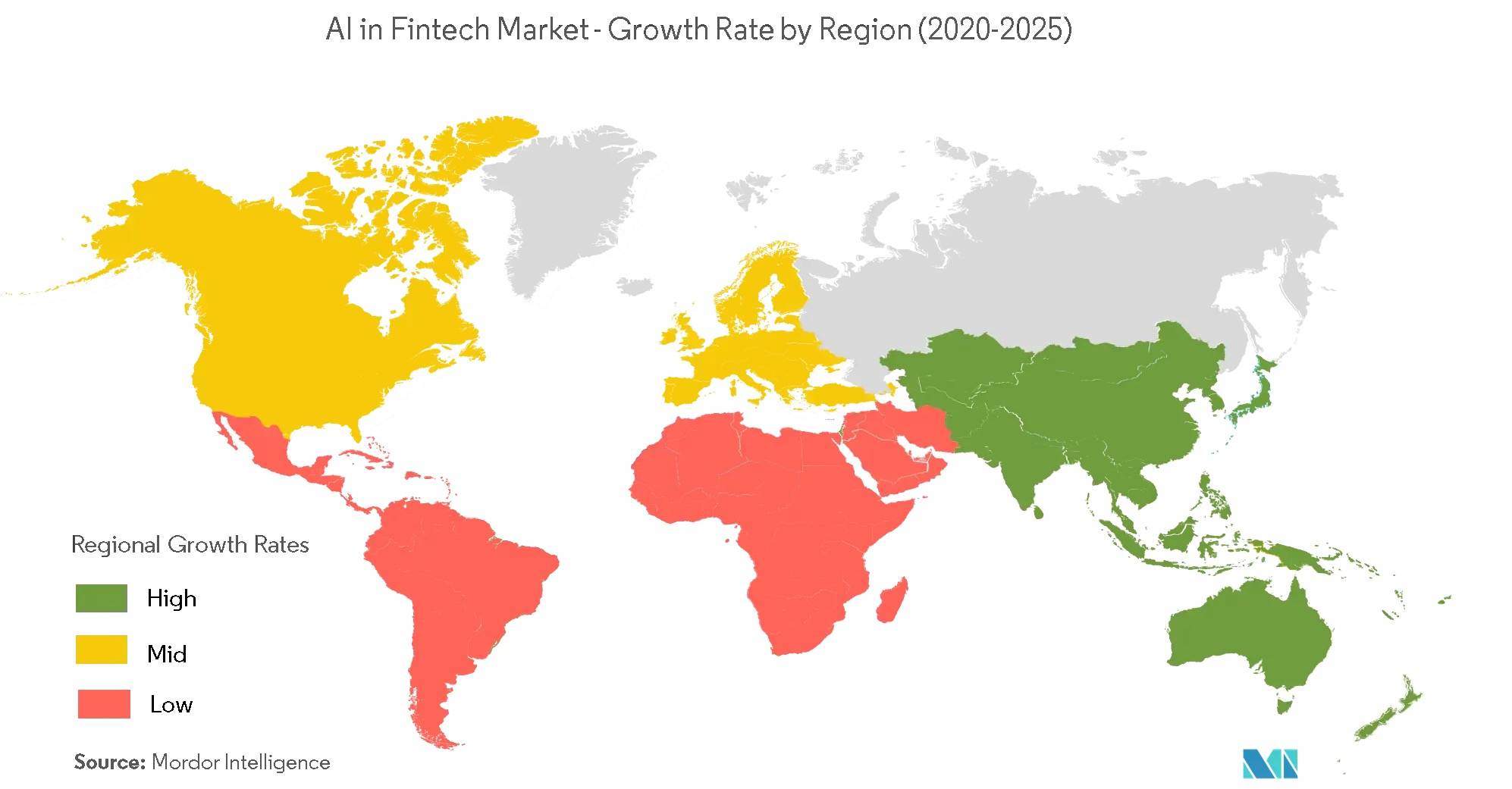 从上图可以看出,在 2020-2025年间,金融科技领域中的 AI 应用数量将以不同的速度增长,其中亚洲发展得最快。然而,随着人工智能技术对金融领域的持续革新,欧洲和北美在未来几年也将出现显著增长。