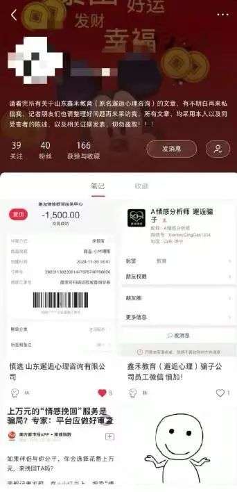 与此同时,上述“老师”已纷纷将其拉黑删除;为其提供服务的挽回机构以及“老师们”的微信昵称几经改名;前述小红书星座博主的账号内容也全部清空……