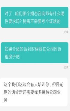 在某招聘软件上,很多情感咨询公司关于“情感/婚恋咨询师”的职位门槛颇低:一方面,岗位职责描述夹带着浓重的销售色彩;另一方面,任职要求并无心理学相关专业、心理咨询证书等硬性要求,多标注“经验不限”、“学历不限”。