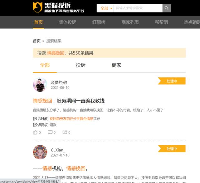 类似的受害者还有很多,在黑猫投诉上,以“情感咨询”为关键词,检索得到的投诉多达600多条,投诉者们的经历大都与晨晨如出一辙。