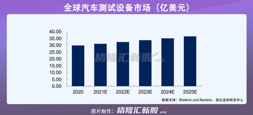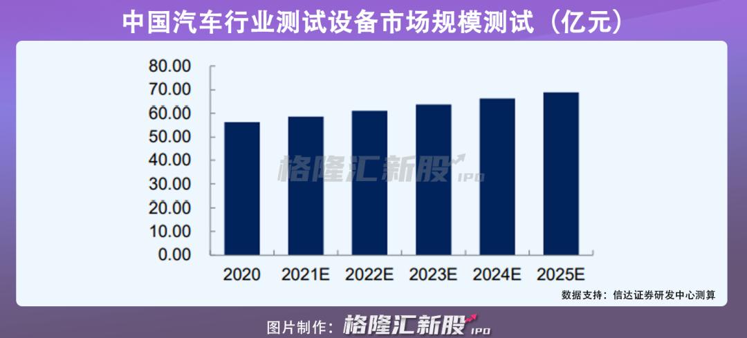 具体汽车测试设备细分市场领域来看,随着造车新势力以及传统车企都在加大新能源汽车的研发,乘着新能源风口,汽车检测设备需求旺盛,根据 Markets and Markets 统计数据显示,预计至 2025 年全球汽车测试设备市场规模将保持 4.1%的复合增速,其中,以我国汽车行业测试设备市场规模占全球市场规模 29%计算,预计到2025年达到56 亿元-77 亿元之间。
