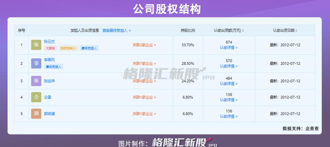 从股权结构来看,张云兰是公司的最大股东和实际控制人,持股33.7%;其次,李景列持股28.5%,张延伸持股24.2%。