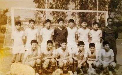 70年代末,王惠良(后排右四)、池明华(后排右二)、杨宁(后排左四)、黄德保(后排左二)进入省青年队接受冼迪雄(后排右一)教练指导,其后几年成为代表梅州足球巅峰时期的国脚(图片来源:王惠良)