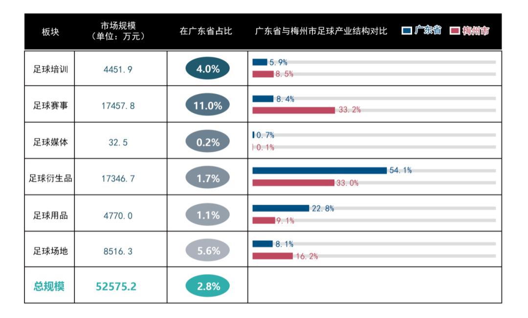 《产业报告》公布测算结果,2019年梅州市足球产业规模为5.3亿元。与广东省足球运动中心发布的《2019广东省足球产业研究报告》同口径对比,2019年广东省足球产业规模为188.8亿元,梅州市在全省占比为2.8%。其中足球赛事和足球衍生品两大板块产值比重最大,在梅州足球产业规模中占比达66.2%。