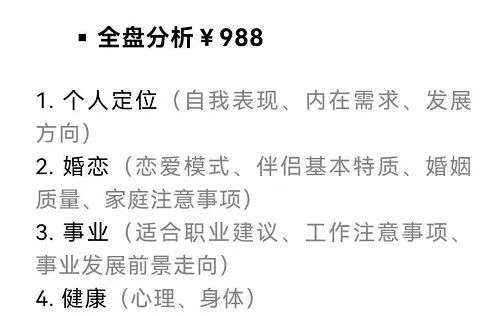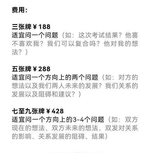 据开菠萝财经报道,一位在小红书有着6万粉丝的塔罗牌博主,一对一占卜的价格因占卜方向和问题数量有所差异:三张牌占卜一个问题为 188 元,五张牌占卜一个方向的两个问题为 288 元,七至九张牌占卜一个方向上的 3-4 个问题,为 428 元,个人全盘分析则需要 988 元。此外,还有针对高端人士们的定制占卜,价格可达数万元。