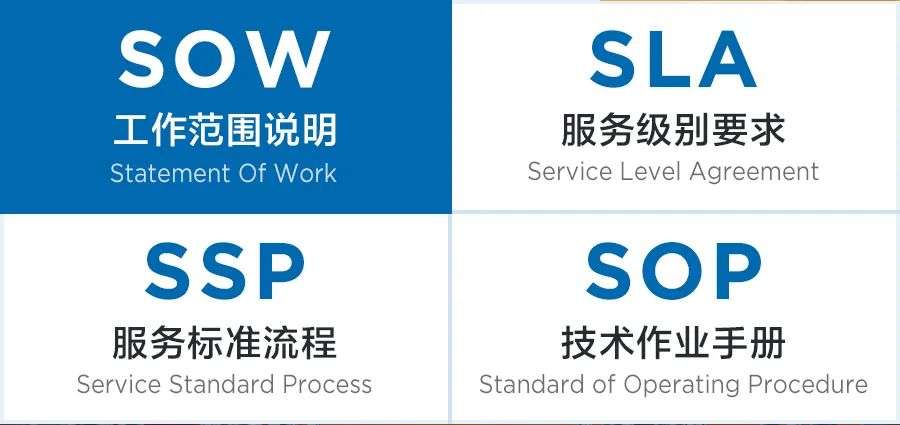 阳光对交付过程负责,将具体的服务需求,转变为实时可见的4S指标,包括SOW(工作范围说明)、SLA(服务级别要求)、SOP(技术作业手册)、SSP(服务标准流程),通过系统实现监控升级,严格把控交付能力与时效,确保每一个环节有据可依。