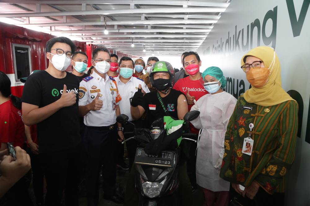 Gojek co-CEO Kevin Aluwi(最左)与 Aldi Haryopratomo(右侧,穿着红色衬衫)在 Halodoc 于雅加达设立的疫苗中心,Halodoc 员工陪同。