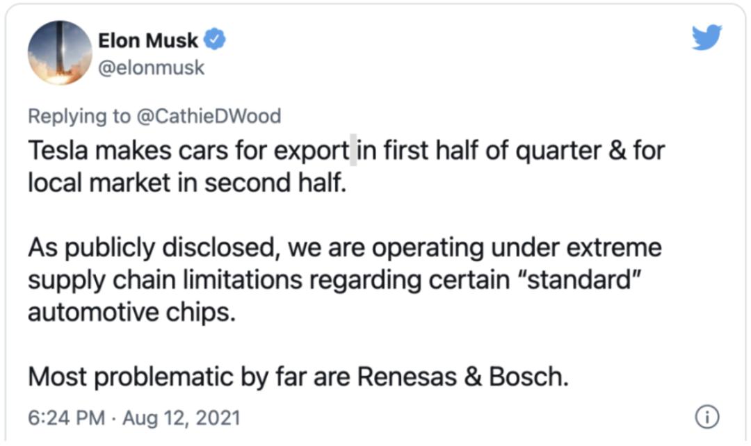 伍德在社交媒体上写道:“很高兴看到特斯拉将中国生产的高质量+高端化电动汽车用于出口,特别是出口到对整车设计标准相当高的欧洲。”就在这条推文下,马斯克回复称:“特斯拉在前半个季度生产的电动汽车用于出口,后半个季度生产的汽车才投放(中国)本地市场。正如公开披露的那样,我们在某些‘标准’汽车芯片方面正受到极端化供应链限制。到目前为止,问题最多的供应商是瑞萨和博世。”