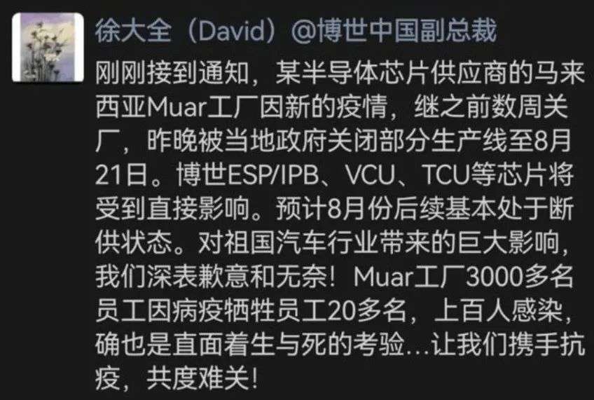 8月17日晚,一则零部件巨头高管的朋友圈被疯传。博世中国执行副总裁徐大全在朋友圈发文,称由于马来西亚新一轮疫情爆发,芯片供应商在该国的工厂被迫关闭,博世的许多芯片产品受到直接影响,8月之后断供,将对国内汽车行业带来巨大影响。