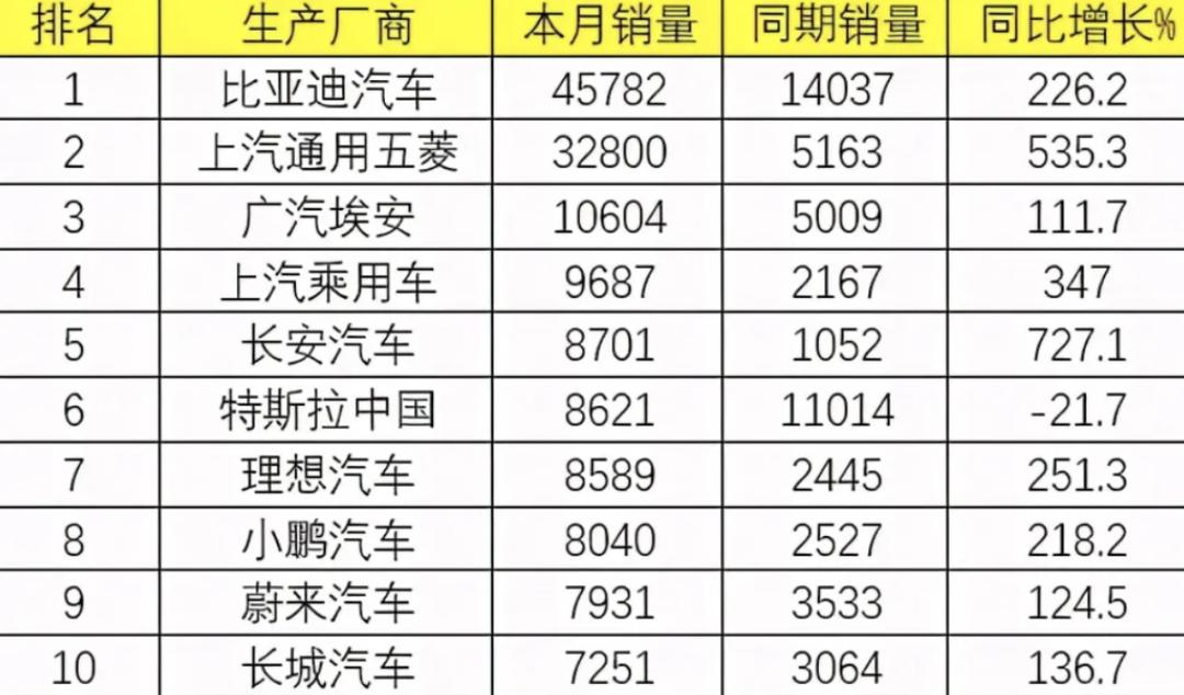 根据乘联会于近日公布的国内新能源汽车销量数据显示,今年7月份,特斯拉在中国市场上的销量大幅下降至8621辆,几乎与蔚来、小鹏、理想处在了同一起跑线上,蔚来、小鹏、理想的销量分别为7931辆、8040辆、8589辆。而中国本土新能源汽车龙头比亚迪的销量高达45782辆,大约是特斯拉的5倍。上汽通用五菱、长安、广汽、上汽的销量分别为32800辆、12398辆、10604辆、9047辆,都要高于特斯拉。